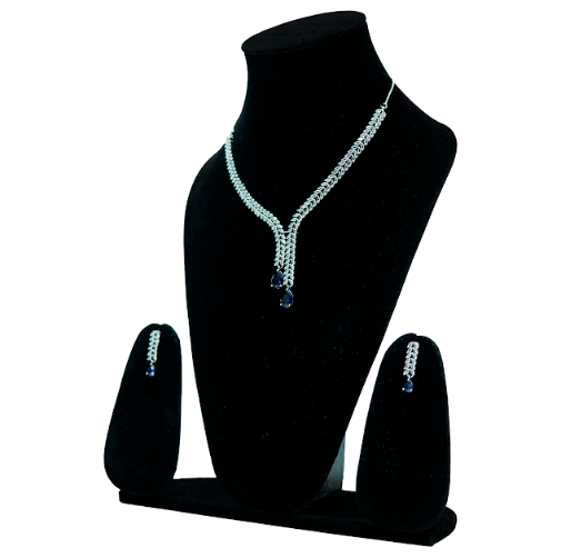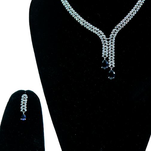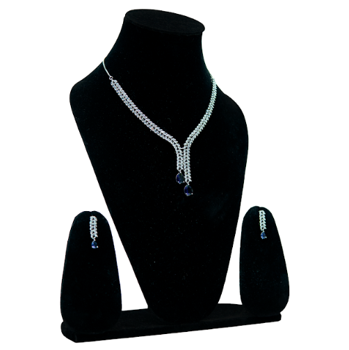 Jewellery Type: Necklace and Earrings Set Design Style: Modern & Elegant Stone Colour: Blue Finish: Silver Tone Occasion: Party Wear, Evening Events, Special Occasions Set Includes: 1 Necklace, 1 Pair of Earrings
