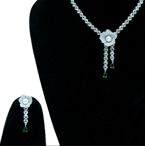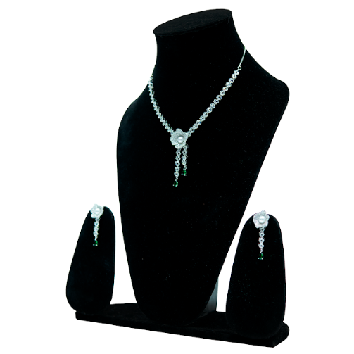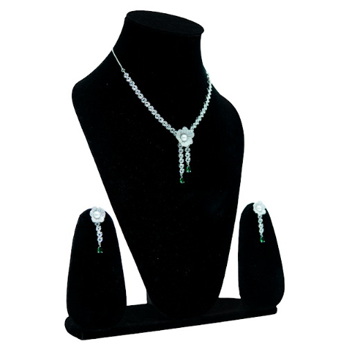 Jewellery Type: Necklace and Earring Set Stone Color: Green Finish: Silver Tone Design: Floral Pendant with Drop Detailing Occasion: Engagement, Party, Wedding, Festive Wear Ideal For: Women & Girls Style: Elegant Traditional Fusion Care Instructions: Keep away from water, perfume, and moisture; store in a dry box