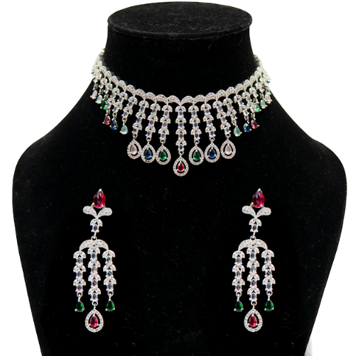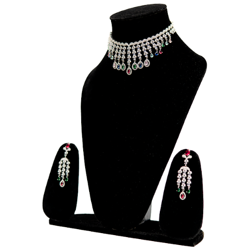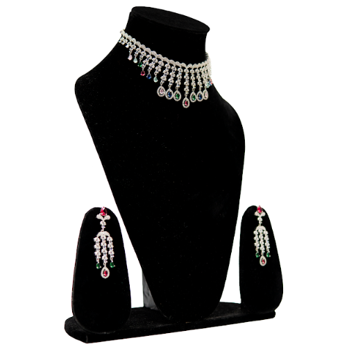 Product Type: Necklace and Earring Set Necklace Style: Choker necklace Design: Stone-studded with hanging drops Finish: Silver-tone Material: High-quality artificial alloy with stones Earrings Type: Matching drop earrings Occasion: Wedding, festive wear, traditional functions Care Instructions: Keep away from water, perfumes, and store in a dry jewelry box