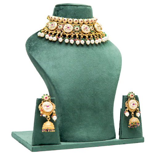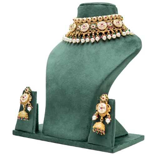 Brand: UffbyIsha Jewellery Type: Choker Necklace Set with Earrings Design Style: Traditional temple jewellery Finish: Antique gold tone Stones Used: Kundan-style stones, colored accents Beads: Pearl drops Occasion: Bridal wear, weddings, temple functions, festive events Necklace Closure: Adjustable thread tie Earrings Style: Jhumka earrings Earrings Closure: Push-back Care Instructions: Avoid moisture, perfume, and chemicals; store in a dry box