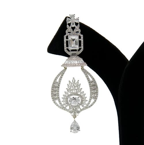Jewellery Type: Earrings Design Style: Bridal chandelier Stone Type: High-shine crystal stones Finish: Silver-tone polish Occasion: Bridal wear, weddings, receptions Closure Type: Push back Look & Feel: Grand, luxurious, statement Care Instructions: Store in a soft box; avoid water, perfume, and harsh chemicals