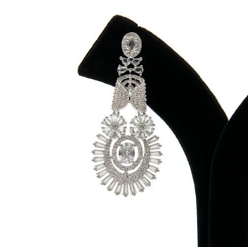 Product Type: Earrings Style: Long Drop Earrings Finish: Silver Tone Stone Color: Clear Occasion: Party Wear, Wedding Functions, Evening Events Closure Type: Push Back Care Instructions: Avoid contact with water, perfume, and sprays Store in a dry jewellery box or pouch Wipe gently with a soft cloth after use