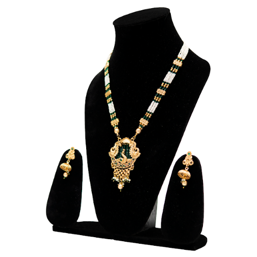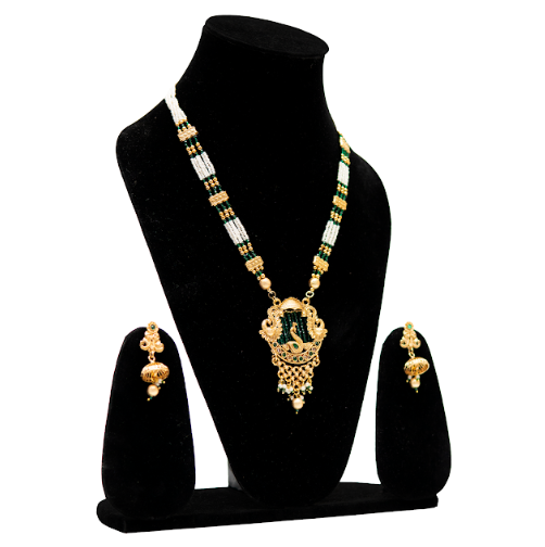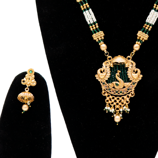 Brand: uffbyisha Jewellery Type: Necklace Set Style: Temple / Antique Finish: Antique Gold Color: Gold with Green Accents Stone Type: Beads Set Includes: 1 Long Necklace, 1 Pair of Earrings Occasion: Bridal, Wedding, Festive, Traditional Functions Wear Type: Traditional & Ethnic