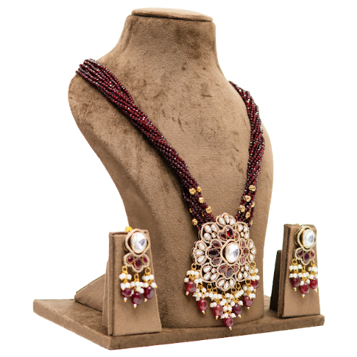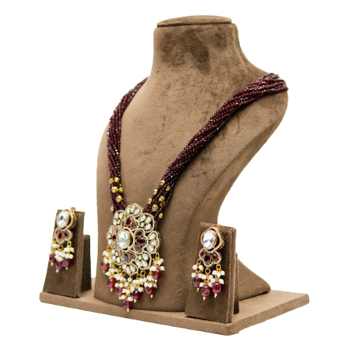 Brand: uffbyisha Jewellery Type: Long Necklace Set Style: Kundan / Bridal Finish: Gold Polish Color: Maroon, Gold, White Stone Type: Kundan Stones, Beads, Pearls Set Includes: 1 Long Necklace, 1 Pair of Earrings Occasion: Wedding, Bridal, Reception, Festive Wear Closure Type: Adjustable Thread / Hook