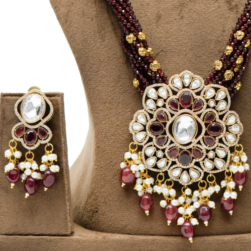 This exquisite kundan bridal jewellery set is designed to make a powerful statement with its rich maroon bead strands and intricately handcrafted kundan pendant. The multi-layered long necklace is highlighted with classic polki-style stones, delicate pearl hangings, and deep-toned accents that enhance its royal appeal. Paired with matching drop earrings, this set beautifully complements bridal lehengas, sarees, and reception ensembles. Its timeless elegance makes it ideal for weddings and special celebrations where tradition meets refined luxury. Keywords used: kundan bridal jewellery set, bridal jewellery set