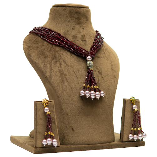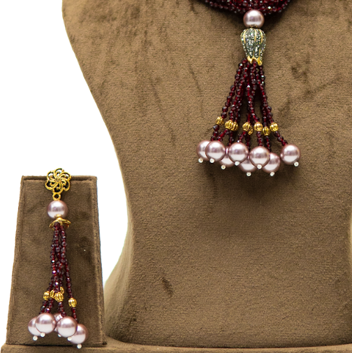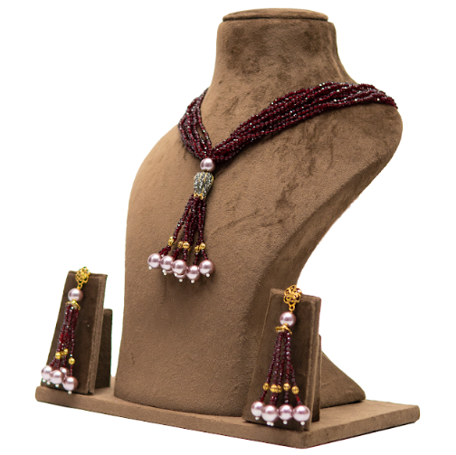 This elegant long necklace set features multiple strands of finely faceted maroon beads, beautifully gathered into a graceful tassel-style centerpiece finished with soft pearl drops. The design is minimal yet striking, making it a versatile piece for festive occasions, weddings, and statement ethnic looks. Paired with matching tassel earrings, this jewellery long necklace adds refined charm to sarees, anarkalis, and fusion outfits. Its lightweight structure and fluid fall make it comfortable for extended wear while maintaining a luxurious appearance.
