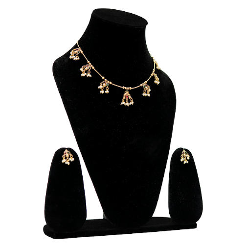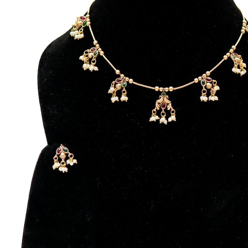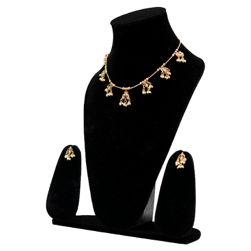 This graceful statement necklace set features delicate temple-inspired motifs suspended along a fine gold-toned chain. Each charm is accented with subtle stone detailing and finished with tiny pearl drops, creating a soft, traditional appeal without overwhelming the neckline. Designed for effortless elegance, this jewellery necklace pairs beautifully with sarees, kurtas, and festive ensembles. The matching earrings echo the necklace’s charm detailing, making this statement jewellery set ideal for cultural gatherings, festive occasions, and everyday ethnic styling.
