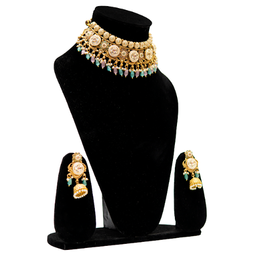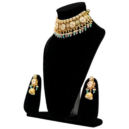 Brand: uffbyisha Jewellery Type: Traditional Choker Necklace Set Set Includes: Choker Necklace & Matching Earrings Finish: Antique Gold Polish Bead Color: Green Design Style: Temple / Heritage Inspired Occasion: Wedding, Bridal, Festive Wear Closure Type: Adjustable thread/chain Care Instructions: Keep away from moisture, perfumes, and chemicals. Store in a dry box after use.