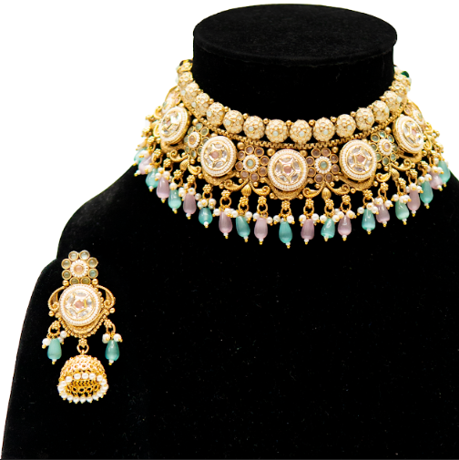 This exquisite antique gold choker necklace set from uffbyisha showcases rich traditional craftsmanship with a regal touch. The choker is beautifully designed with intricate circular motifs, stone embellishments, and delicate green bead drops that add elegance and contrast to the gold finish. The necklace sits gracefully on the neckline, creating a bold yet refined statement. Paired with matching jhumka-style earrings featuring green bead accents, this set is perfect for weddings, festive celebrations, and special occasions where traditional charm is desired.