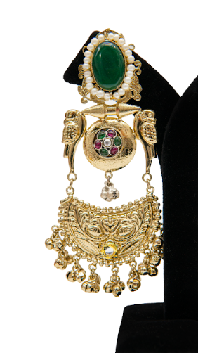Jewellery Type: Earrings Style: Traditional / Ethnic / Long Drop Finish: Antique Gold Tone Material: Premium alloy Stone Color: Green with multicolor stone detailing Motif: Bird design with engraved patterns Occasion: Wedding, Festive, Bridal Functions Closure Type: Push Back Weight: Medium to Heavy Care Instructions: Avoid water, perfume & chemicals; store in a dry jewellery box