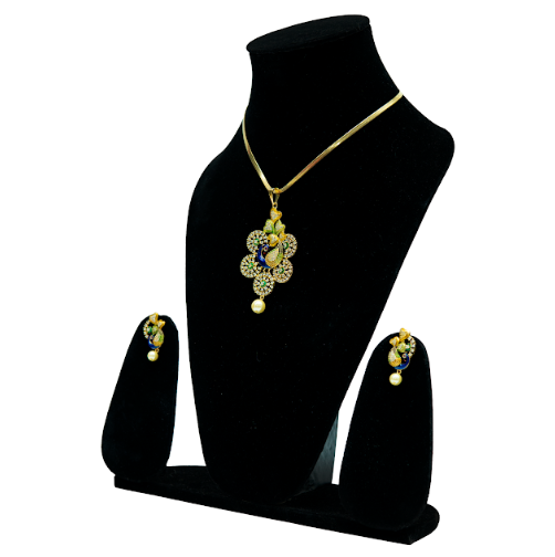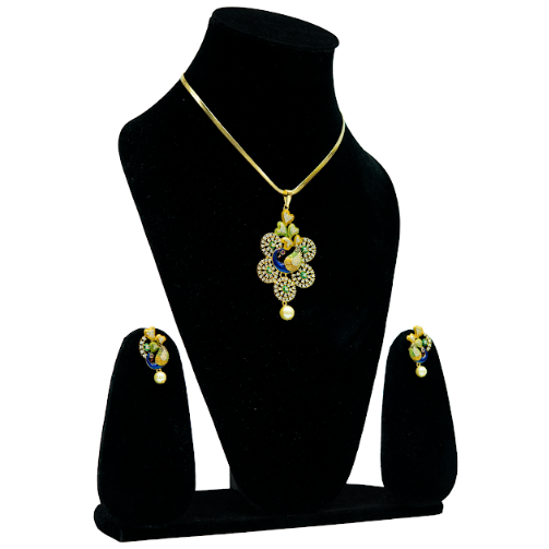 Jewellery Type: Pendant Necklace with Earrings Design Motif: Peacock Stone Colours: Green & Blue Finish: Gold Tone Embellishments: Stone work with pearl drop Occasion: Festive, Wedding, Traditional Functions Set Includes: 1 Pendant Necklace, 1 Pair of Earrings