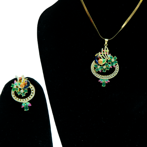 Jewellery Type: Pendant Necklace with Earrings Design Motif: Peacock Stone Colour: Green with multicolour accents Finish: Gold Tone Design Style: Traditional & Elegant Occasion: Festive Wear, Wedding Functions, Cultural Events Set Includes: 1 Pendant Necklace, 1 Pair of Earrings