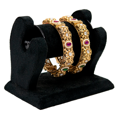 • Product Type: Traditional Bangles • Finish: Antique Gold Polish • Stones Used: Red, green, and white stones • Design Style: Vintage / Temple-inspired work • Pair: Set of 2 • Size Options: Available in standard sizes • Weight: Comfortable & medium weight • Suitable For: Weddings, festive events, ethnic wear, special occasions • Material: High-quality alloy with premium polish • Care Tips: Keep away from water, perfume, and sweat. Wipe gently with a soft cloth and store safely.