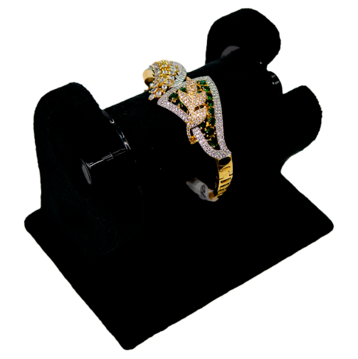 This bracelet has a gold finish and is set with deep green stones, highlighted with white stones around the edges. The leaf-shaped pattern in the centre gives it a neat decorative look, and the curved design adds a smooth flow to the piece. The colours stand out well and give the bracelet a rich touch without looking too heavy. It’s a good pick for festive clothes, wedding outfits or evening wear. The bracelet feels comfortable on the wrist and has clean stonework that adds a bright sparkle.